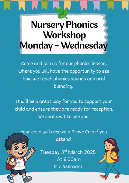 Nursery Phonics Workshopn - 9:00am in classrooms for Mon-Wed children.