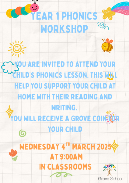 Year 1 Phonics Workshop. 9:00am in classrooms